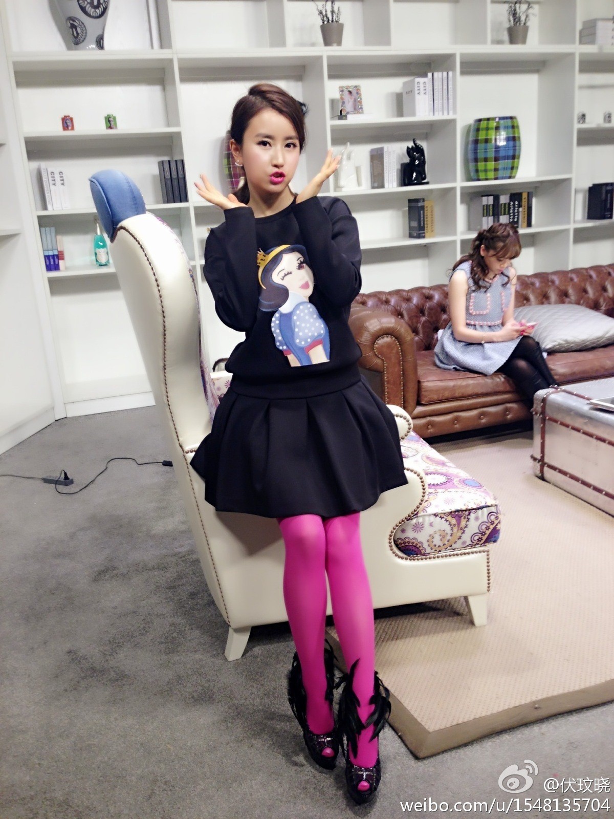 伏玟晓坐于高脚凳上,一腿微曲,展现出修长腿部线条与时尚高跟鞋的利落搭配